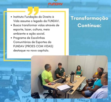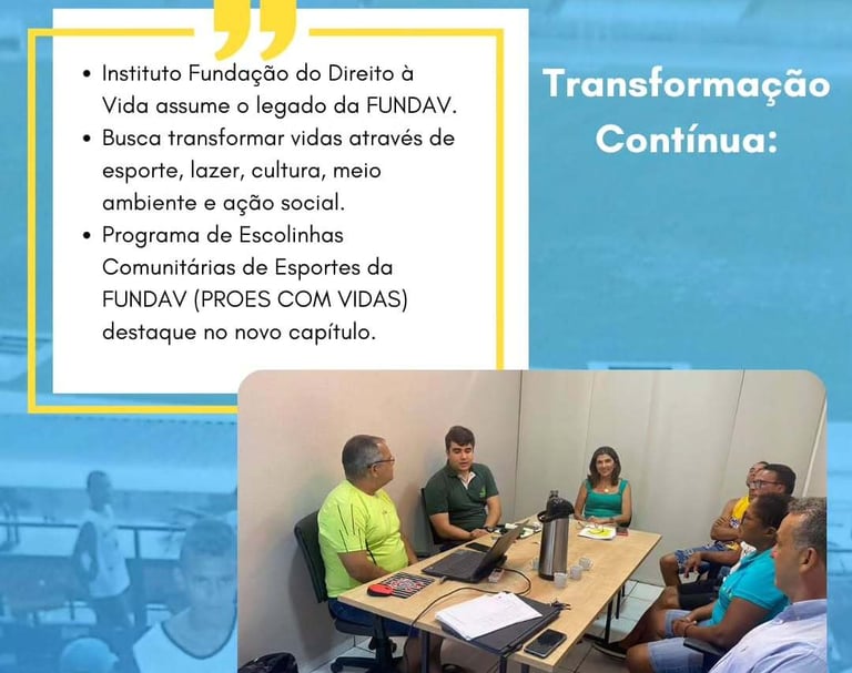 Com um Estatuto conciso e moderno, a Associação se transforma no INSTITUTO FUNDAÇÃO DO DIREITO À VIDA. Com uma diretoria composta por indivíduos mais experientes e capacitados, espera-se que utilize os instrumentos legais para continuar o seu legado de TRANSFORMAR AS VIDAS DAS PESSOAS por meio do ESPORTE, LAZER, CULTURA, MEIO AMBIENTE e AÇÃO SOCIAL, tendo como destaque o PROES COM VIDAS (Programa de Escolinhas Comunitárias de Esportes da FUNDAV).